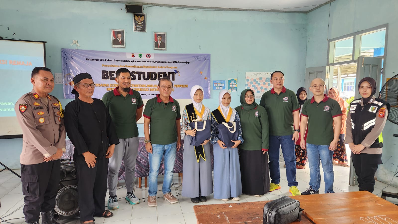 Dalam program BEST STUDENT (Bersama Eliminasi Stunting Melalui Siswa Terpilih Untuk Dukung Edukasi Antar Teman) di Kecamatan Sumberjaya Pada Siswa di SMA Negeri 1 Sumberjaya dihadiri Ketua IDI Kabupaten Majalengka, Guru SMA Negeri Sumberjaya, Muspika Kecamatan Sumberjaya, Dokes Polres Majalengka dan Siswa SMA Negeri 1 Sumberjaya.